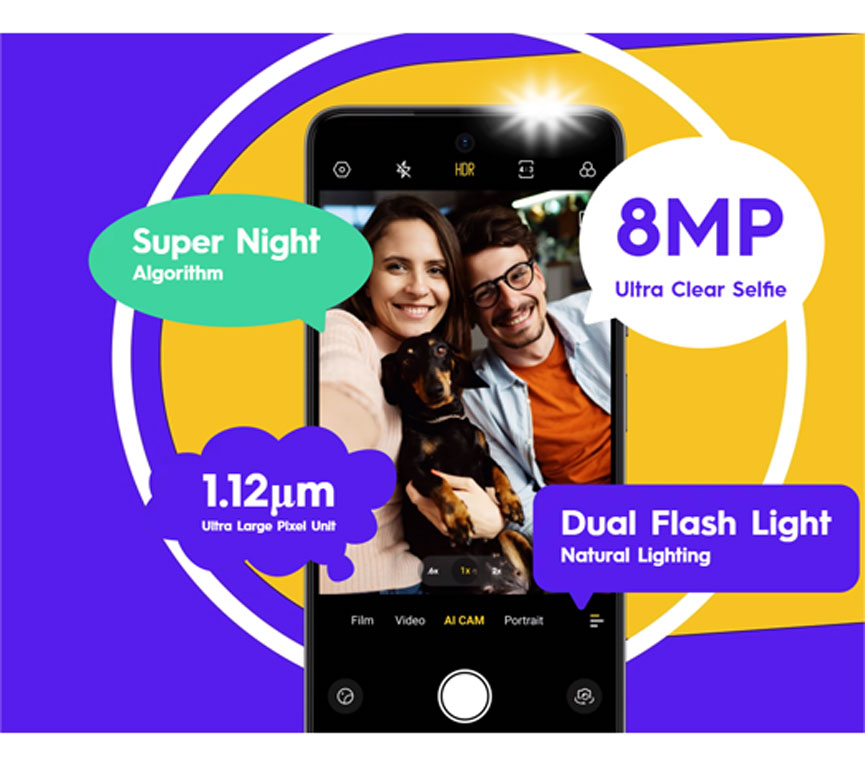 من الغسق حتى الفجر سواء في الداخل أو الخارج يوجد دائمًا تطبيق الصور الشخصية الرئيسية الموجود في المقدمة لتقديم كاميرا بدقة 8 ميجابكسل للحصول على وضوح حاد مع بكسل حساس للضوء، وفلاش مزدوج وإضاءة ملء الشاشة لتوهج متألق بالإضافة إلى تحسينات جمالية تم اختبارها في المعركة لكل بشرة خطوة إلى دائرة الضوء ودع نجمك الداخلي يتألق بشكل مضاعف