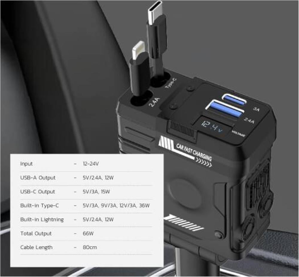 • إجمالي خرج 66 وات شحن سريع وفعال بقدرة 36 وات من كابل Type-C و12 وات من كابل Lightning، مما يضمن طاقة سريعة لجميع أجهزتك.