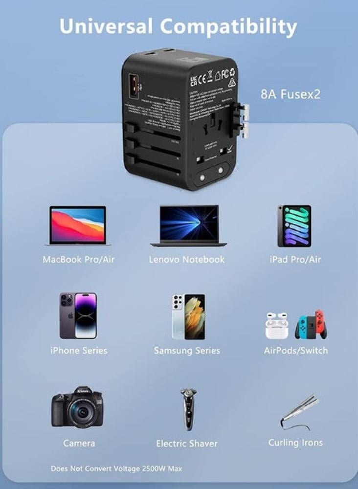 توافق متعدد المقابس: مزود بمقابس متعددة للاستخدام في أكثر من 150 دولة.